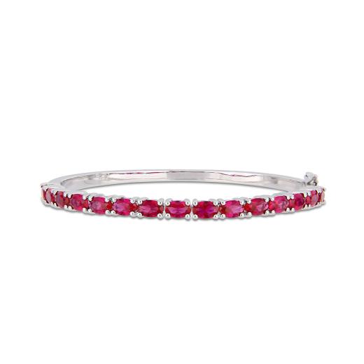 This classic yet trendy gemstone bangle is crafted in lustrous sterling silver and features 15 oval-cut created rubies in a semi-eternity bangle design. This bracelet is a perfect way to add a touch of colour, elegance and sophistication to any ensemble. This stunning piece makes a lovely addition, suitable for all occasions.