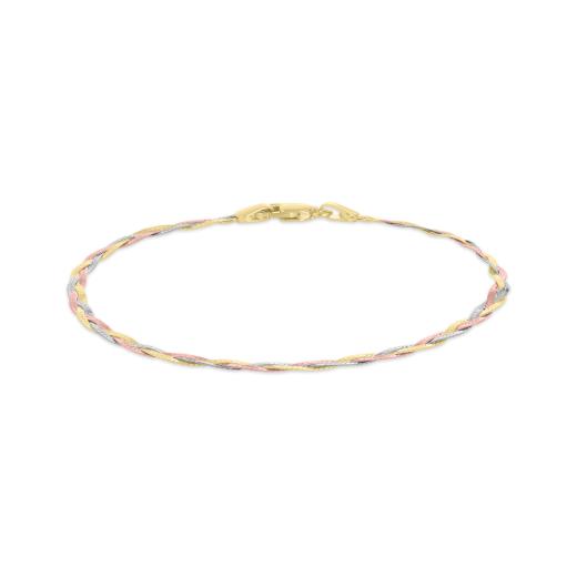 This bracelet features three intertwined strands in a beautiful braid pattern. The tri-colour combination adds depth and richness to the piece, making it a versatile and timeless accessory.