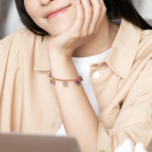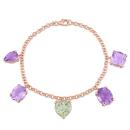 This vibrant multi-shape multi-colour 5-stone station bracelet is crafted in lustrous rose-plated sterling silver and features one oval-cut, (11x9mm) and one cushion-cut, (10x10mm) prong-set pink amethyst, one oval-cut, (12x10mm) and one pear-cut, (10x7mm) prong-set amethyst (10x7mm), and one heart-cut, prong-set green quartz (amethyst) (11x11mm) gemstones suspended on the chain. Enhanced with a polished finish, this exquisite bracelet measures 7.25 inches in length and is secured with a lobster clasp. Wear this charming bracelet to your next casual outing.