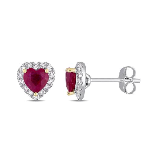These unique heart-shaped halo stud earrings are set in 14-karat white gold with yellow gold prongs and feature rubies and diamonds in a halo stud design. These earrings are a lovely versatile addition to any ensemble.