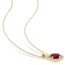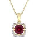 This pendant features a vibrant created ruby set in 10K yellow gold, complemented by diamonds totaling 0.10 carats. The rich red hue of the ruby is beautifully enhanced by the sparkling diamonds, creating a striking and elegant design.