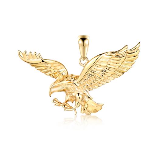 The 10K yellow gold setting of the pendant adds a warm and regal touch to this striking piece, creating a luxurious backdrop for the intricate design. The eagle's features are rendered with intricate details in the feathers, wings, and talons, showcasing the artisan's dedication to perfection.