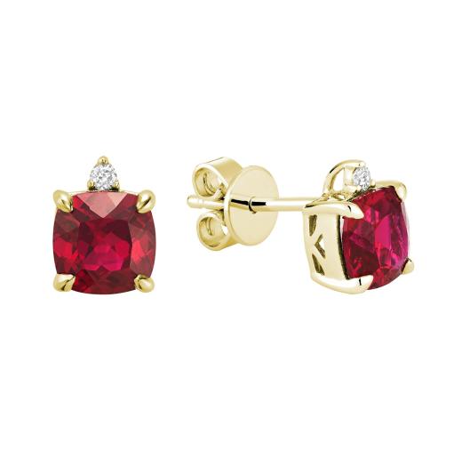 Simple and timeless, this gorgeous pendant is crafted in 10-karat yellow gold and features a cushion-cut created ruby accented by a round-cut diamond. A classic look, this stunning piece is a perfect choice for today's contemporary and sophisticated person.