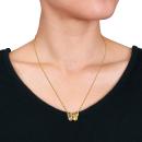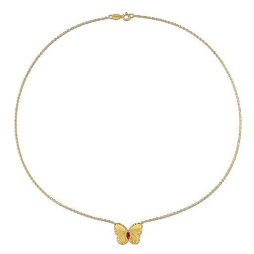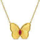 Add a touch of whimsy to your ensemble with this charming 1/5ct TGW Marquise-Cut Created Ruby Butterfly Necklace, elegantly crafted in Yellow Plated Sterling Silver. The intricate butterfly pendant, adorned with vibrant created ruby stones, exudes a playful and feminine allure. Suspended from a 17-inch chain, this necklace is perfect for adding a pop of colour and elegance to any outfit. Embrace the timeless beauty of butterflies and the radiant glow of yellow-plated silver with this exquisite piece that effortlessly enhances your style with its delicate charm