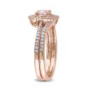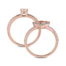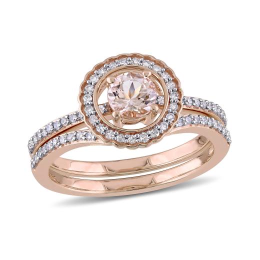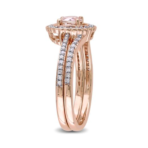 This fabulous bridal set is crafted in 10-karat rose gold and features a morganite engagement ring. The wedding band is uniquely designed to fit snugly over the engagement ring with a halo of diamonds.