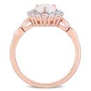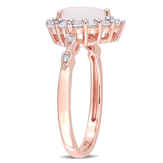 This shimmering opal, created white sapphire and diamond teardrop halo engagement ring is crafted in rose gold and features a pear-cut, prong-set opal gemstone at the center with a halo of 13 round-cut, prong-set created white sapphire gemstones and four round-cut, pave-set diamond-accents in a gorgeous gemstone bridal design. A modern take on a classic bridal style, this gemstone and diamond ring is a perfect choice for the woman you love as you celebrate this special milestone and begin the next chapter of your lives together.