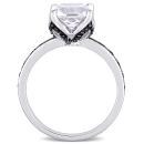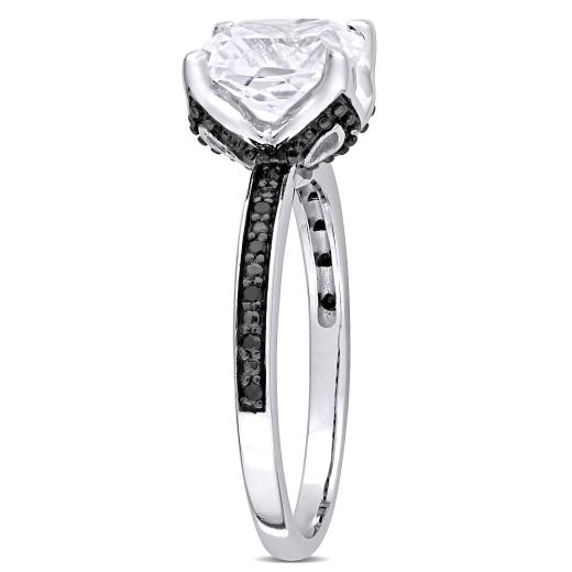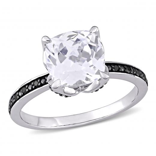 Graceful and romantic, this charming created white sapphire and diamond ring is beautifully crafted in 10-karat white gold to add a touch of refinement and elegant style to your look. A sumptuous, cushion-cut created white sapphire is raised over the delicate shank with petal-shaped prongs and 12 round-cut, pave set black diamonds adding shimmer along its high polished band. Instantly add a touch of colour, sophistication and class to any ensemble with this stunning gemstone and diamond ring.