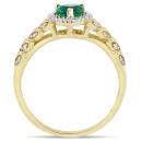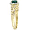 This unique halo heart gemstone ring is crafted in 10-karat yellow gold and showcases a heart-cut, prong-set created emerald stone at the center of its 13 round-cut, pave and buttercup-set diamond halo leaf design. This distinctive design truly captures the trends of the moment, coupled with a timeless look and feel. Whether worn as an engagement ring or simply a lovely new gemstone piece, this ring is a perfect addition to any jewelry collection. A lovely choice for that special May birthday in your life.