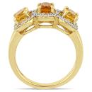 This bright and bold citrine, madeira citrine and diamond ring is crafted in yellow plated sterling silver and features oval-cut madeira citrine and citrine stones at its center surrounded by a total of 50 round-cut, prong-set diamonds in a unique split shank three-stone halo design. Instantly add a touch of color and style to any ensemble with this trendsetting gemstone and diamond ring.