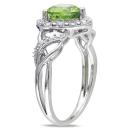 This stylish ring features a heart-cut peridot center stone enhanced by a halo of 17 round white diamond side stones. This beautiful ring is crafted of fine sterling silver, and glimmers with a high polish finish.