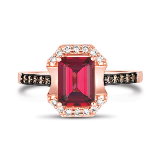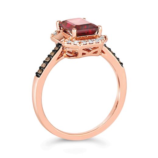At the center of the ring, a captivating rhodolite gemstone takes the spotlight. Rhodolite is a vibrant and enchanting gemstone known for its mesmerizing purplish-red colour, exuding a sense of passion and elegance. It is a coveted gemstone choice for those seeking a touch of unique and alluring beauty.