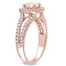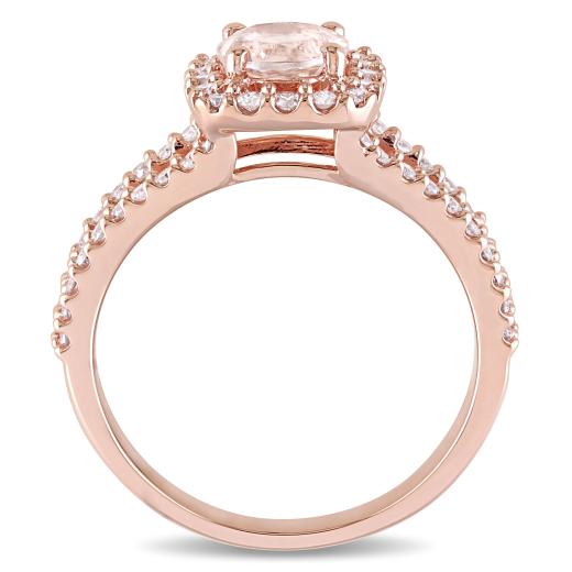 Declare your everlasting love with this one-of-a-kind halo engagement ring which features a blistering round-cut morganite center stone and eye-catching round white diamond side stones set on a split shank. This exquisite ring is crafted in lustrous 14-karat rose gold and is enhanced with a high polish finish.