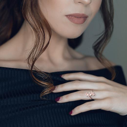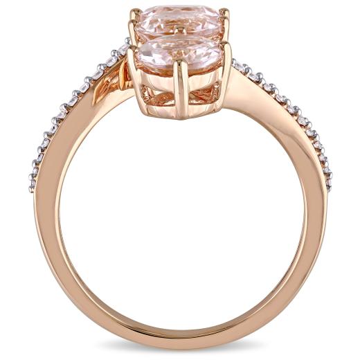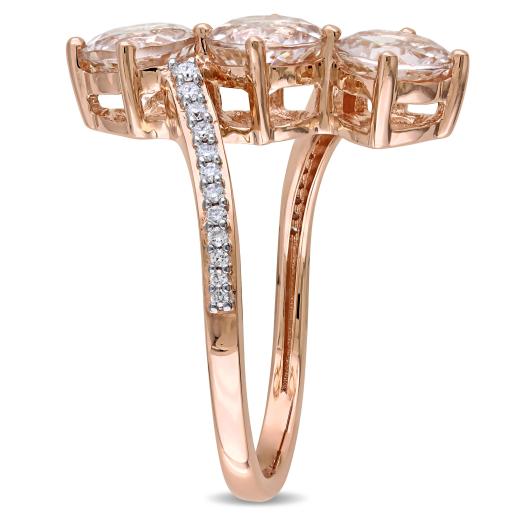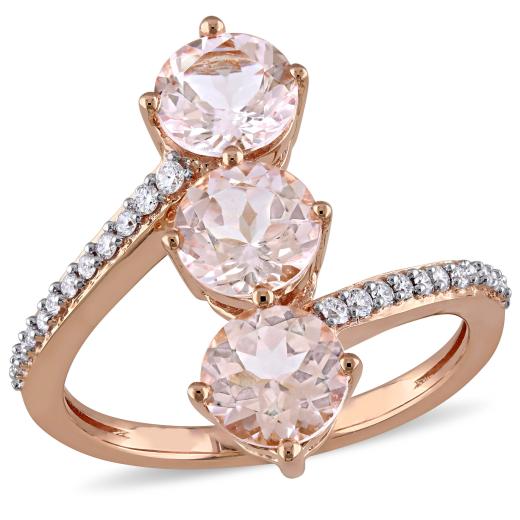 This trendsetting morganite and diamond bypass ring is crafted in lustrous 14-karat rose gold and features three round-cut, prong-set morganites along with 24 round-cut, prong-set glistening diamonds in a unique and sophisticated three-stone bypass design. This gemstone and diamond ring is a perfect statement piece for all occasions. Coordinate this piece with any ensemble and instantly add a touch of elegance and style to your look.