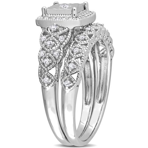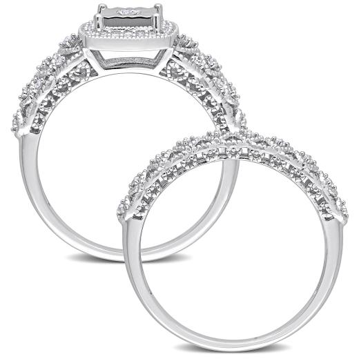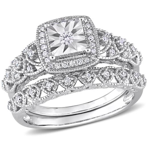 This pretty cushion halo bridal ring set is crafted in lustrous sterling silver. This stunning ring set features 51 round-cut shimmering diamonds that are beautifully embellished on the ring in prong and flush settings. This unique wedding ring is complemented by a matching stackable semi-eternity style wedding band. Enhanced with a milgrain finish, this cushion diamond bridal set is a perfect symbol of your everlasting love and a beautiful addition to any jewelry collection.