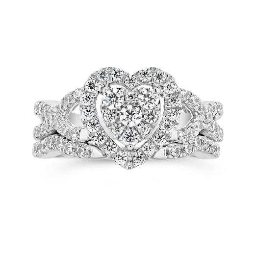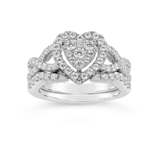Charm her with this sweet 1.00CTW diamond bridal set. Proudly featuring a heart formation and twisting knots, this set is as unique and lasting as your love. Set in dazzling white gold, with a wedding band that perfectly compliments the engagement ring, this set will be with you for a lifetime of memories.
