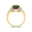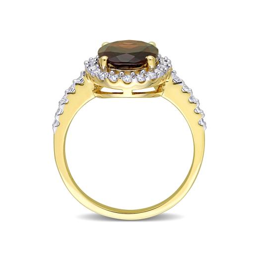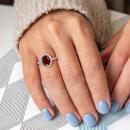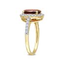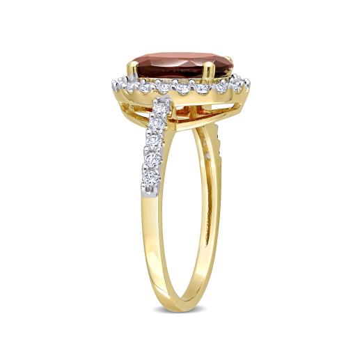 Add a stunning piece to your collection with this lovely halo ring. Crafted in lustrous yellow gold, this glamorous ring features an oval-cut, prong-set garnet decorated by 30 round, buttercup-set created white sapphire gemstones in a halo design. Polished to a brilliant shine, this vibrant ring can be coordinated with matching earrings for a flawless look.