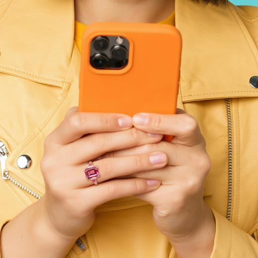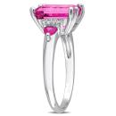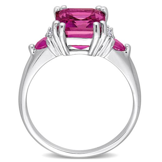 This exceptional three-stone ring is crafted in lustrous sterling silver and features an octagon-cut, prong-set pink topaz (10x8mm) adorned with trilliant-cut, two prong-set ruby (3x3mm) gemstones and eight round-cut, prong-set diamonds (G-H, I2; I3). Enhanced with a polished finish, this ring is a perfect statement piece for your next party.