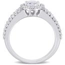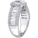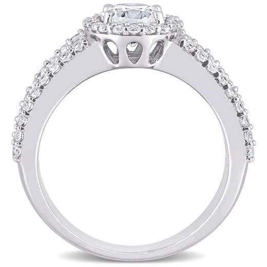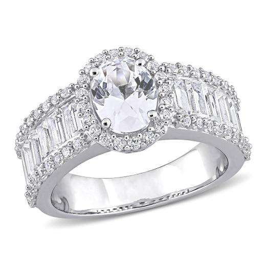 This outstanding halo engagement ring is crafted in lustrous 10-karat white gold. This marvelous wedding ring features an oval cut, 12 baguette-cut and 56 round-cut, created white sapphires that are beautifully embellished on the ring. Enhanced with a high polish finish, this gorgeous bridal ring is perfect to get down on your knees.