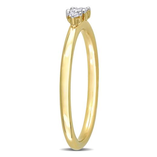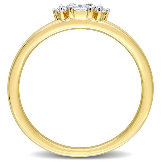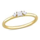 This classy ring is ideal for women with delicate taste in jewellery. Crafted in luminous 14k yellow gold, this dainty ring features one central princess-cut diamond embellished with two round-cut prong-set diamonds (G-H, I1-I2) mounted symmetrically on either side. Enhanced with a polished finish, this ring is a simple and sophisticated accessory.