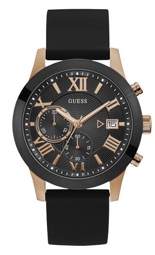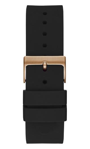 Add a sleek finish to your looks with the Black multifunction watch. Features rose gold-tone trim, a logo detail and a silicone buckle. Day and date dials. U1055G3
