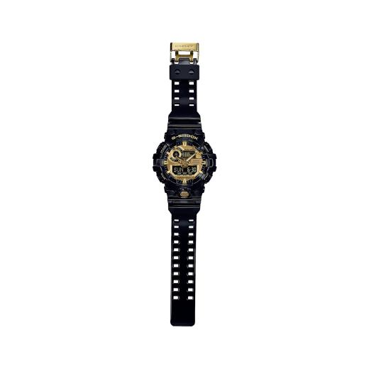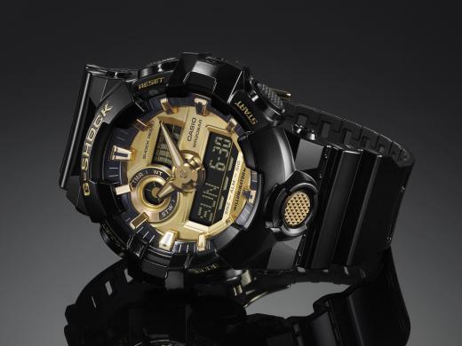 From G-SHOCK, the watch brand that is constantly setting new standards for timekeeping toughness, come a new model with garish colouring. The base model is the GA700, which uses original resin molding technology that makes it possible to form analog hands, dial, and hour markers of resin that shines like metal. This black and gold model has an overall shiny finish for a tough and energetic look. GA710GB-1A.
